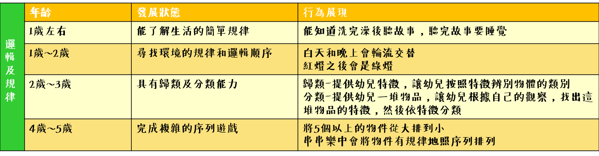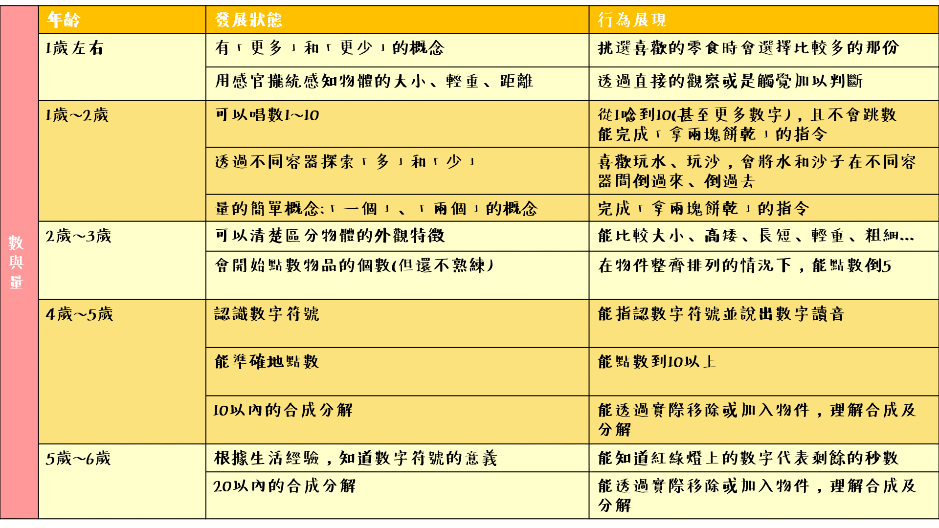 在幼兒階段讓孩子接觸到數學概念應該從具體到抽象,從簡單到複雜,了解幼兒認知概念的發展順序可以幫助成人有效地選擇各種認知遊戲,每位孩子的發展歷程不同,展現出對應認知行為的年齡會有些許差異,不過發展的順序會是循序漸進的,例如:孩子有先具備一一對應的點數能力才能學習恆合成及分解,因此讓我們一起來認識幼兒認知發展的歷程: